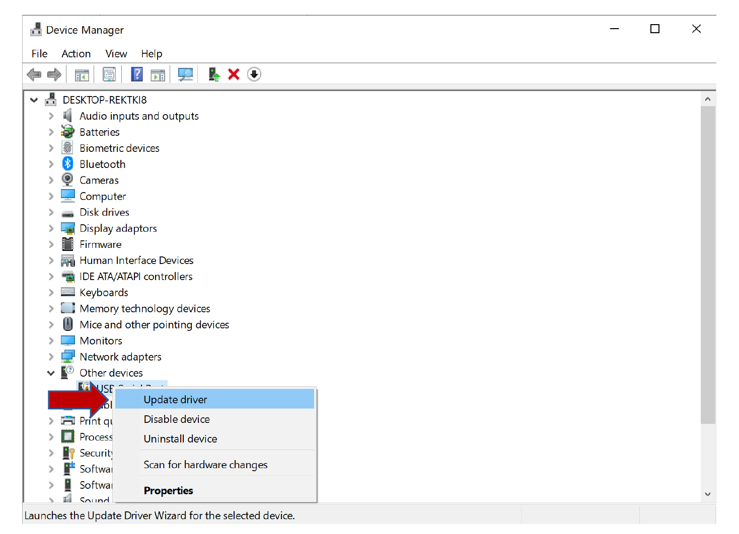 ...or amongst the Ports: - Right click on USB Serial Device/Port, select 'Update driver':